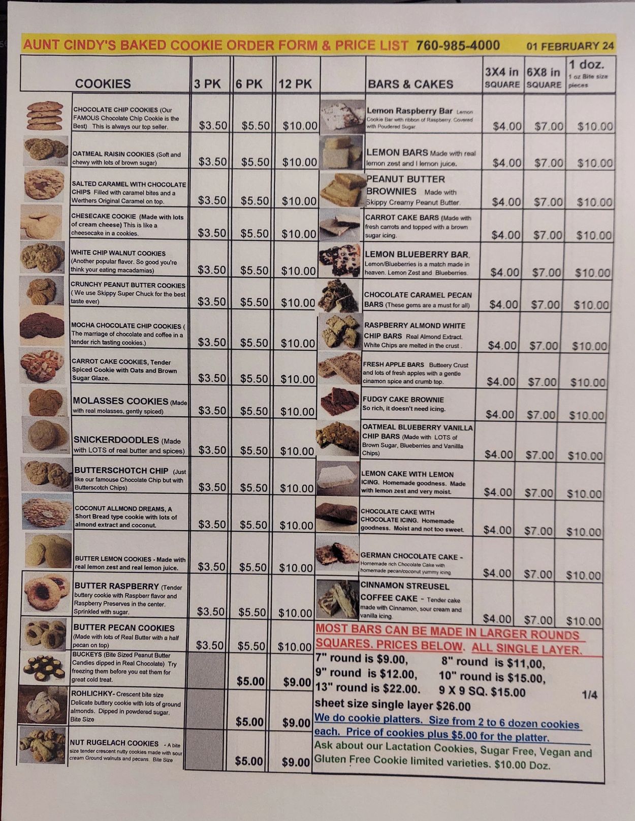 Place an order for pick up. We are happy to meet you. You will be so glad you tried Aunt Cindy's Cookies.